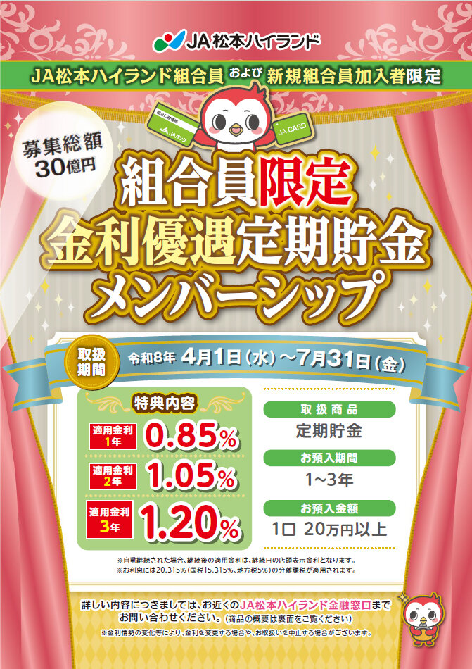 | 販売対象 | JA松本ハイランド組合員および新規組合員加入者の方限定 ※JAネットバンク・ATMからのお預入れはできません。 |
