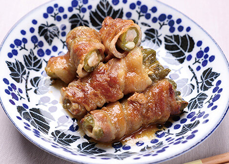 ①ピーマンは縦半分に切り、ヘタ・種・ワタは取らずに残す。1つずつ手でつぶしてチーズを詰め、豚肉1枚をきつく巻き付け、全体に薄く薄力粉をまぶす。