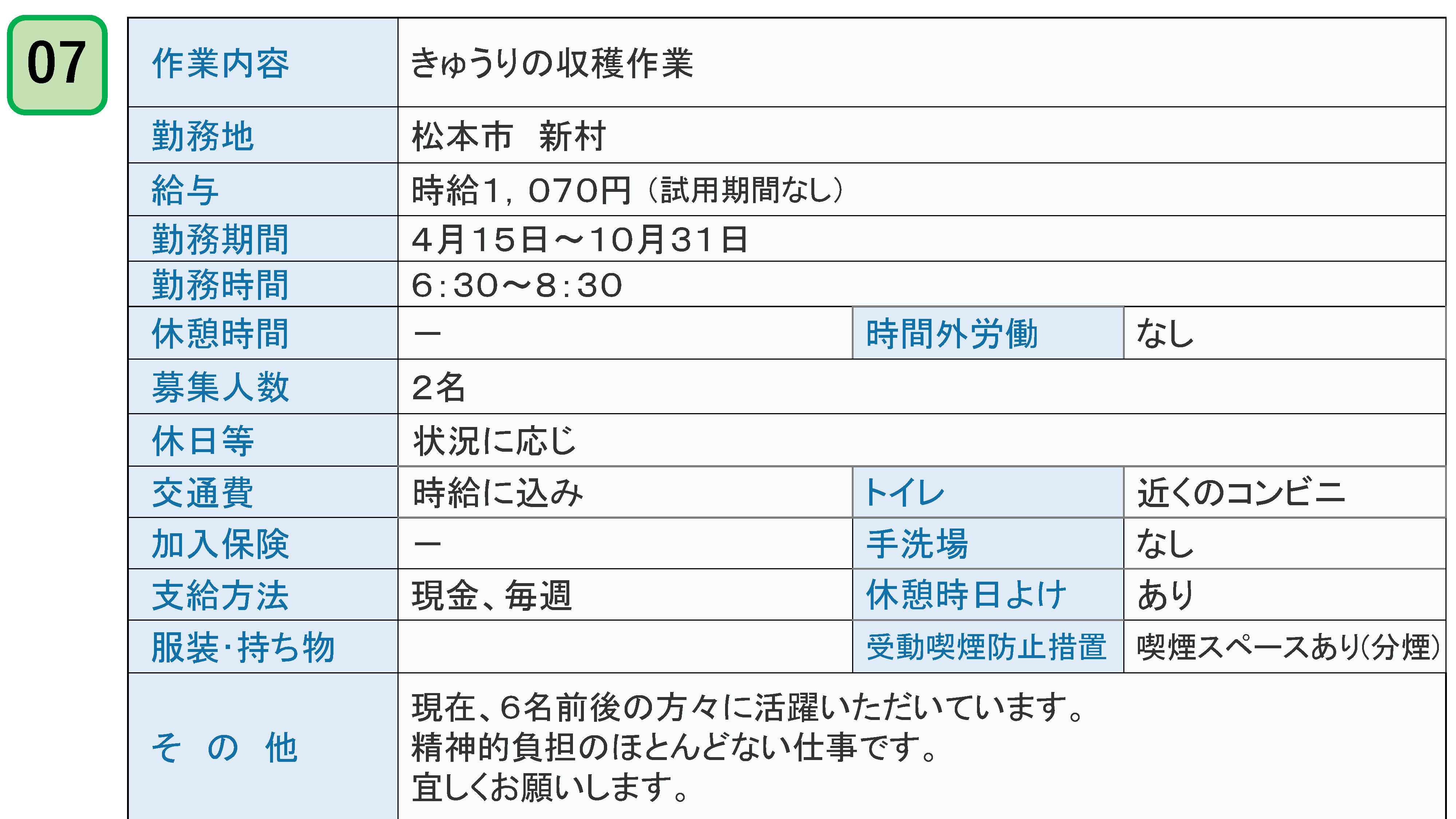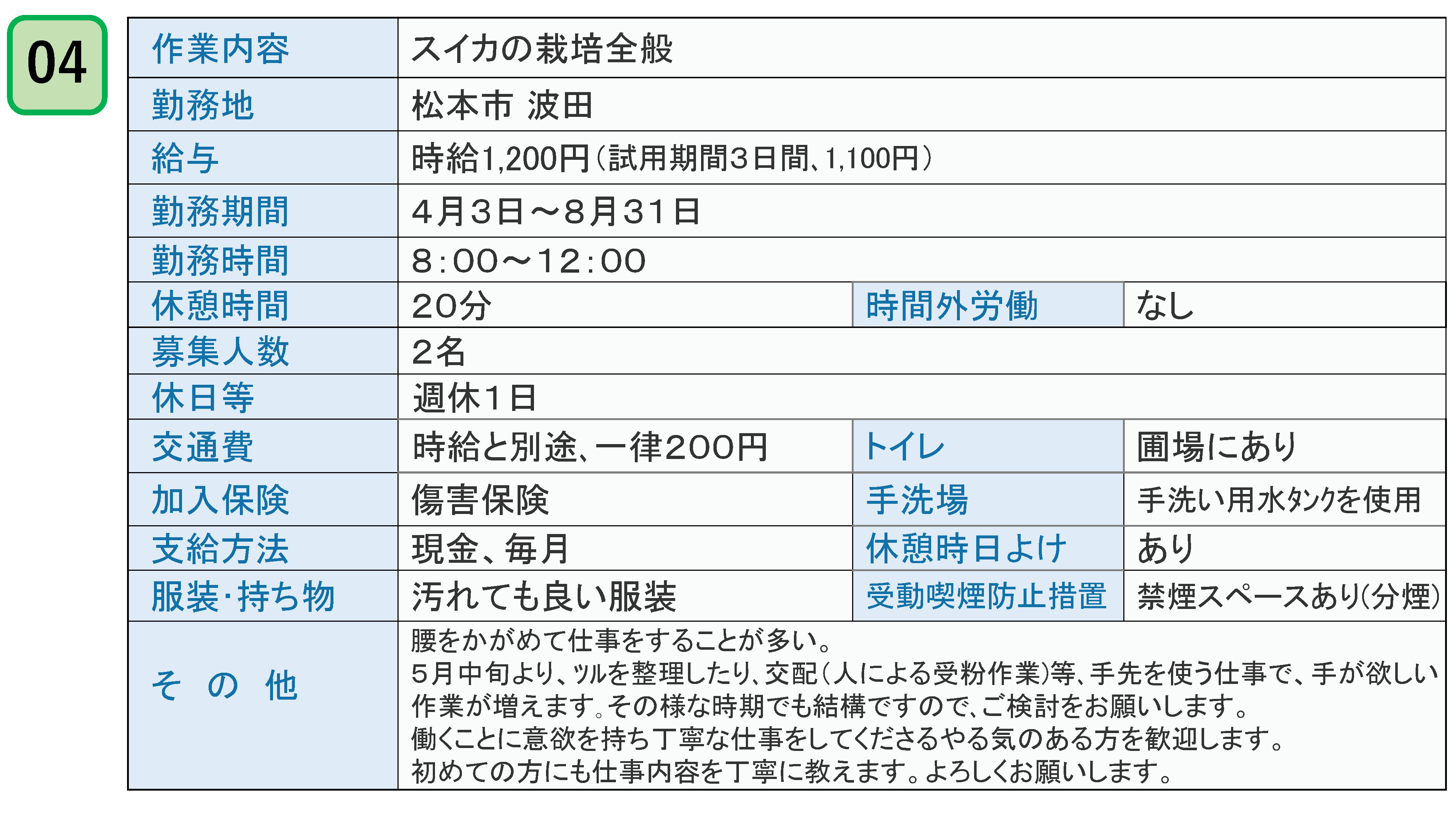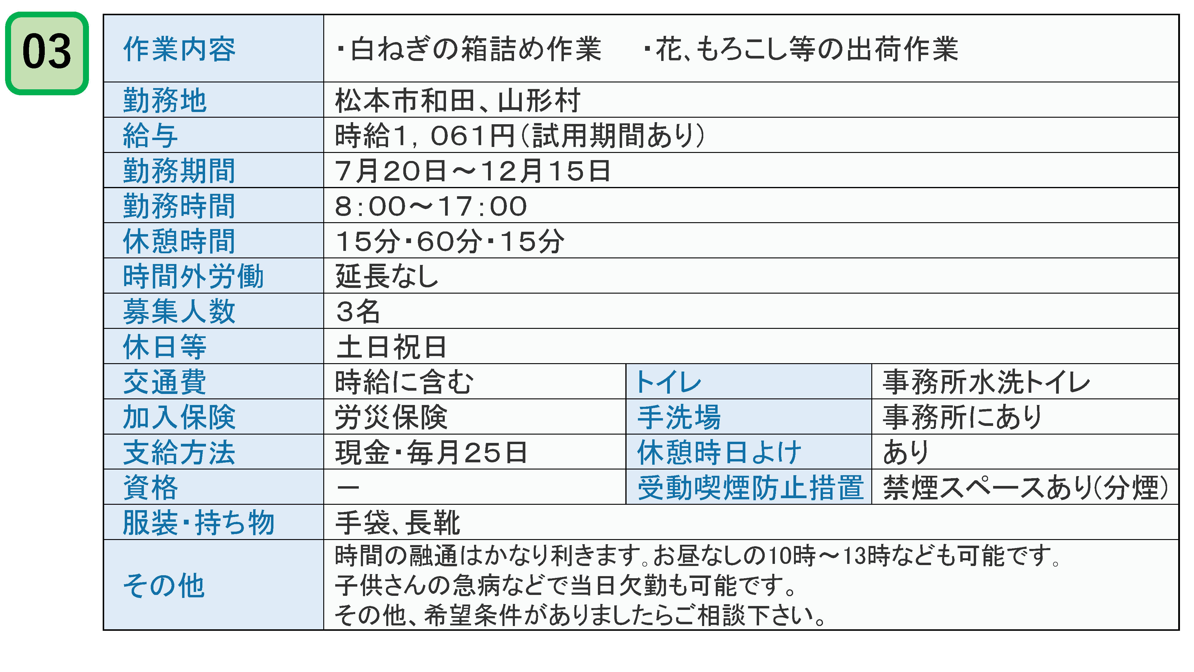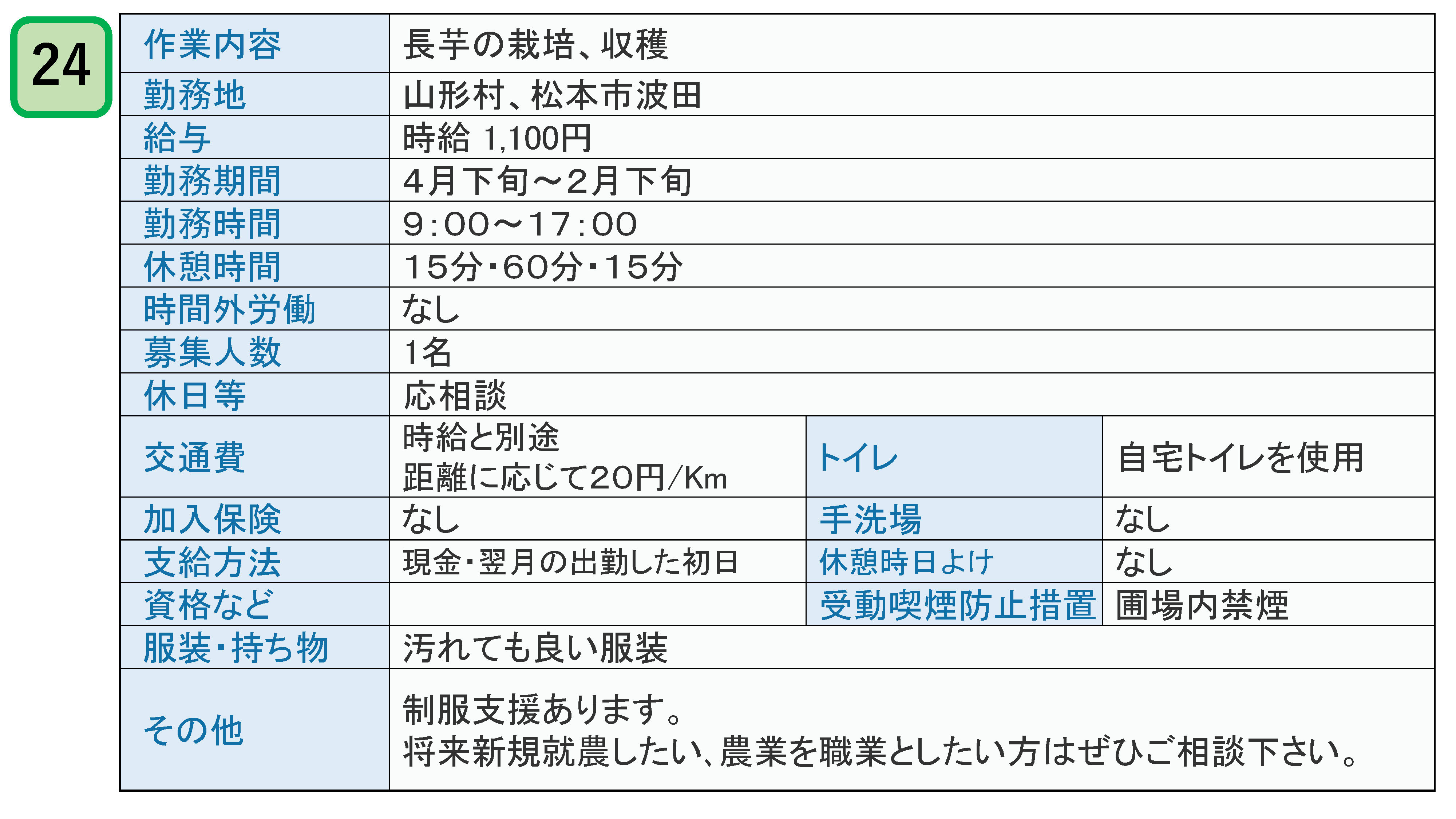 農作業のアルバイトを探している方(求職者)に対して、JA松本ハイランドが働き手を探す農家(求人者)を仲介斡旋するものです。雇用契約は、農家と求職者双方で合意のうえ締結いただくためトラブルに関しては、JAは一切の責任を負いませんのでご了承ください。