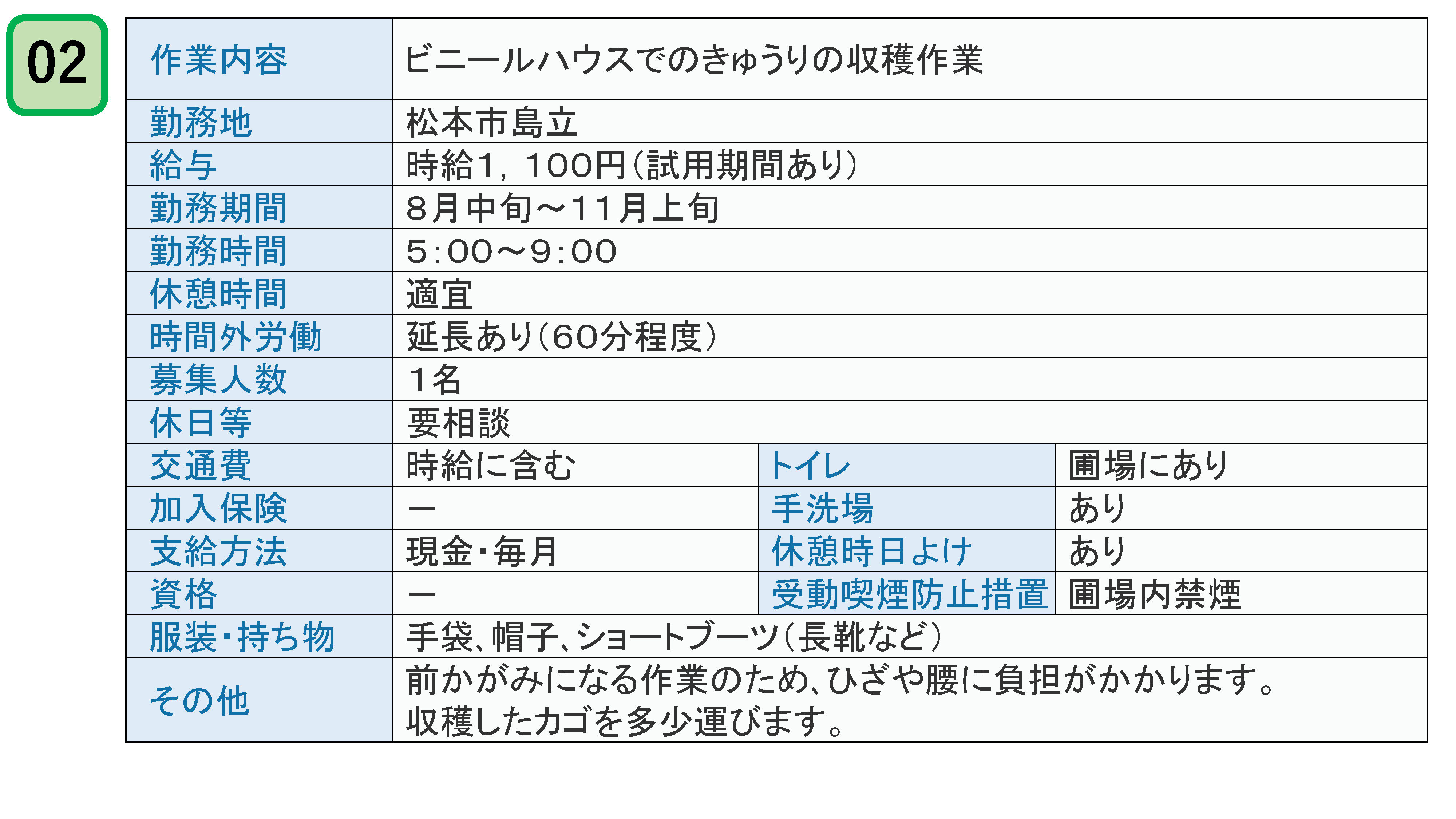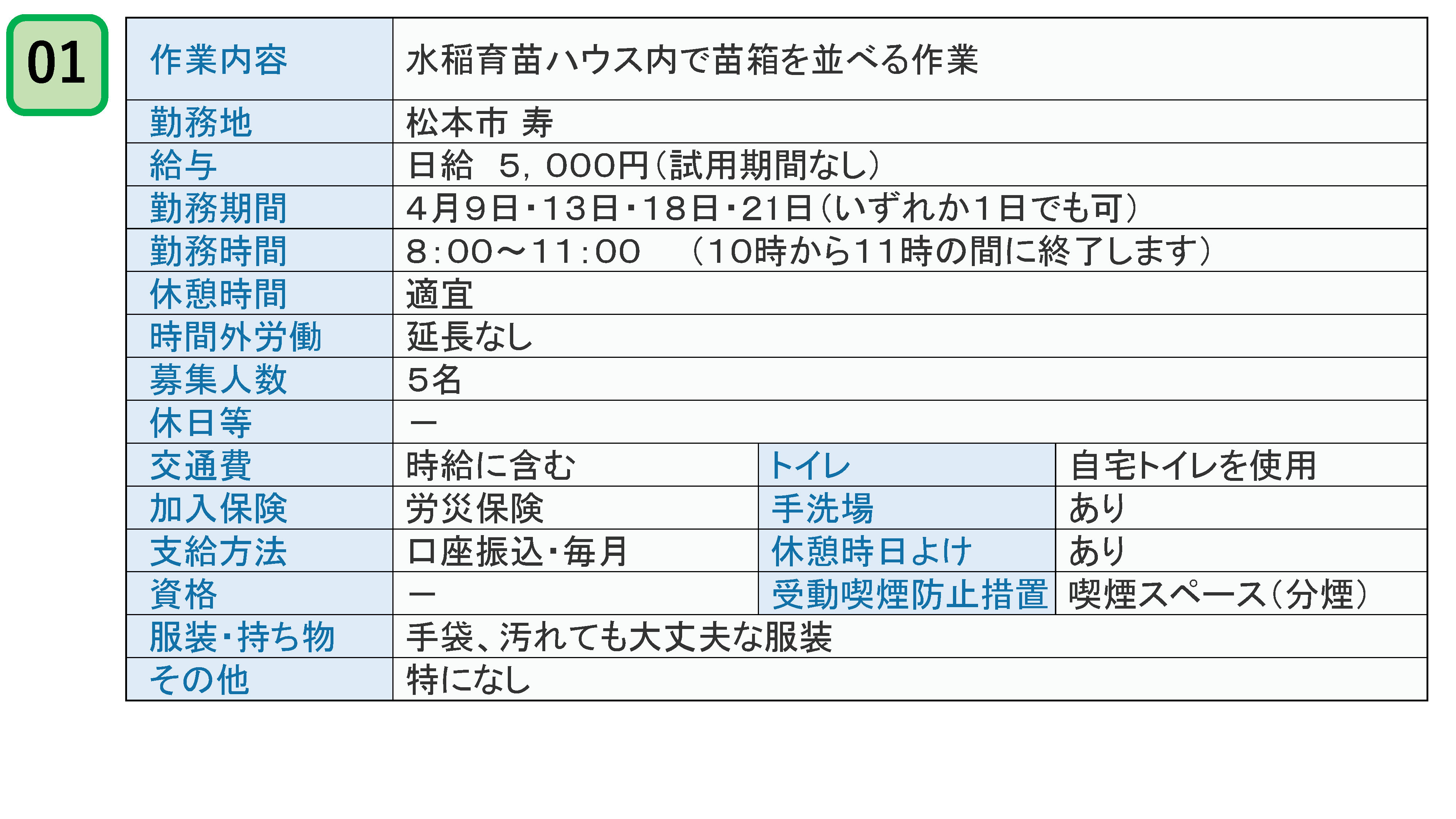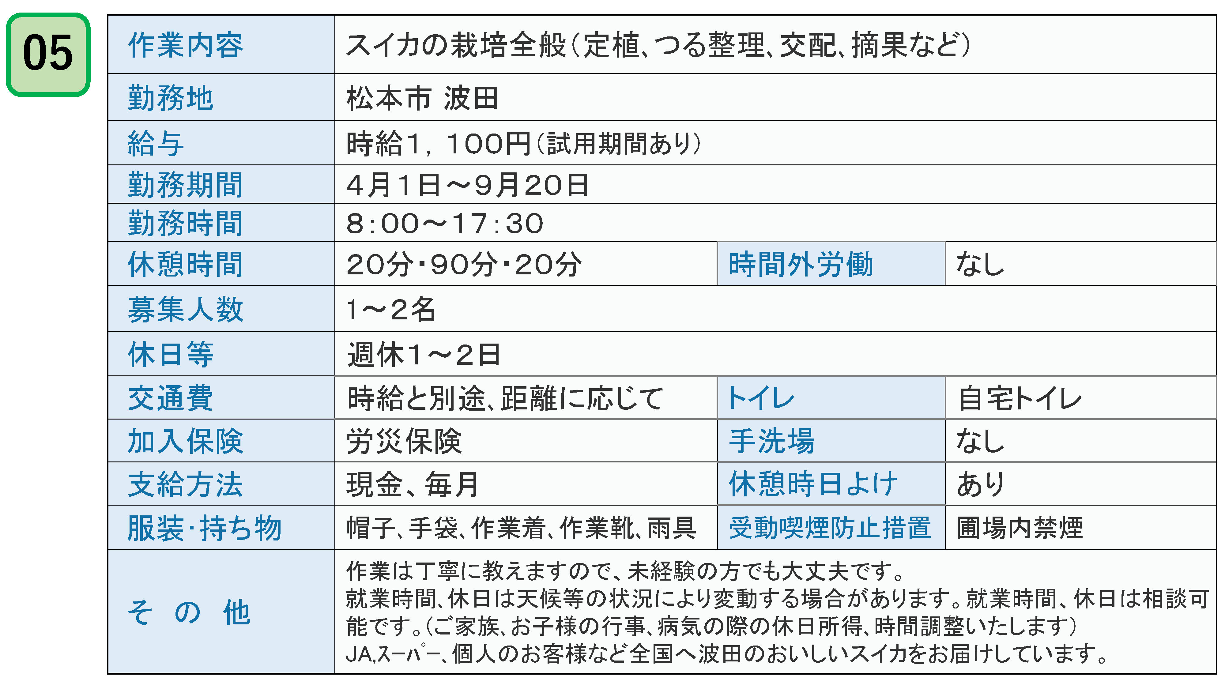 農作業のアルバイトを探している方(求職者)に対して、JA松本ハイランドが働き手を探す農家(求人者)を仲介斡旋するものです。雇用契約は、農家と求職者双方で合意のうえ締結いただくためトラブルに関しては、JAは一切の責任を負いませんのでご了承ください。