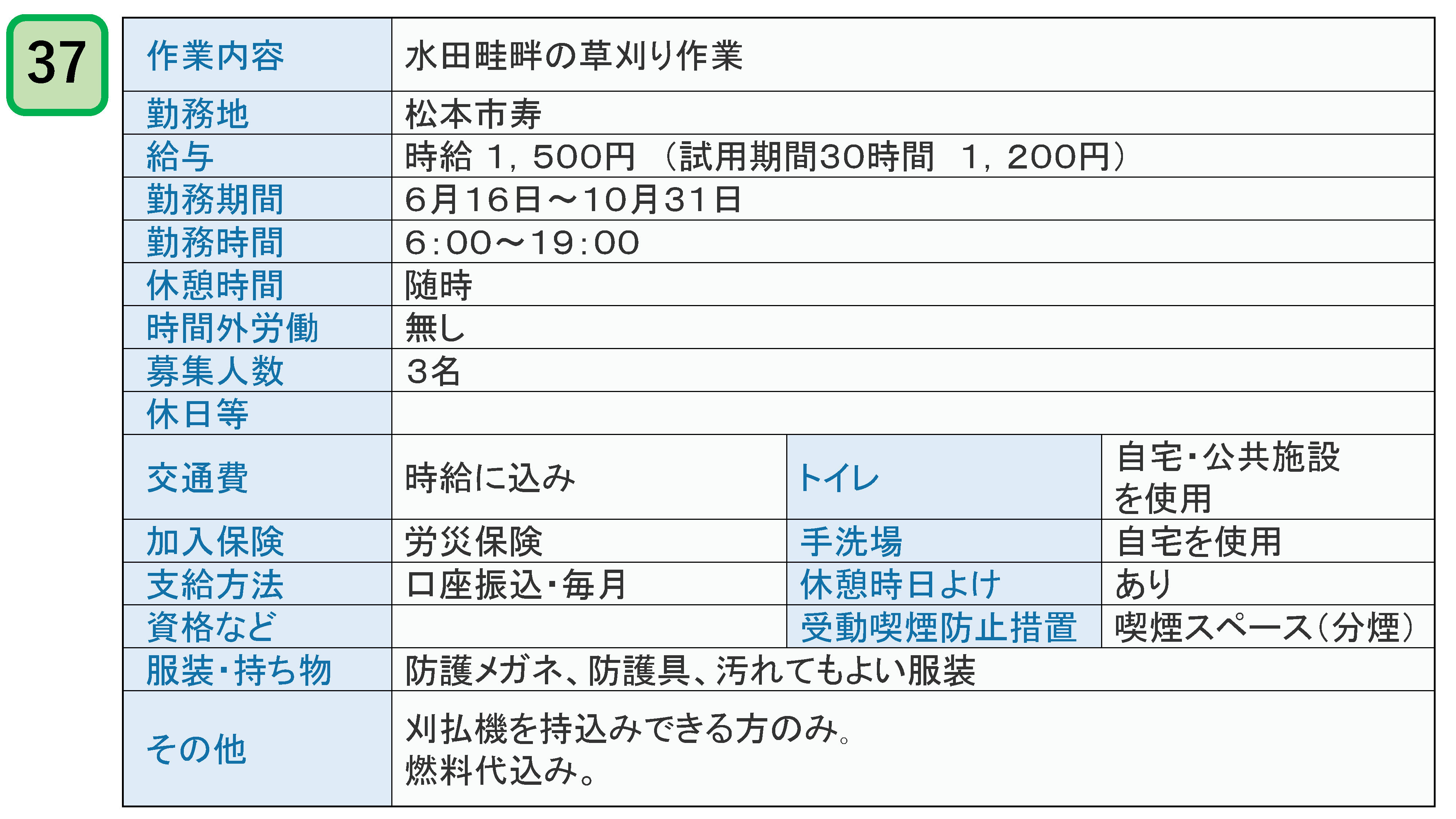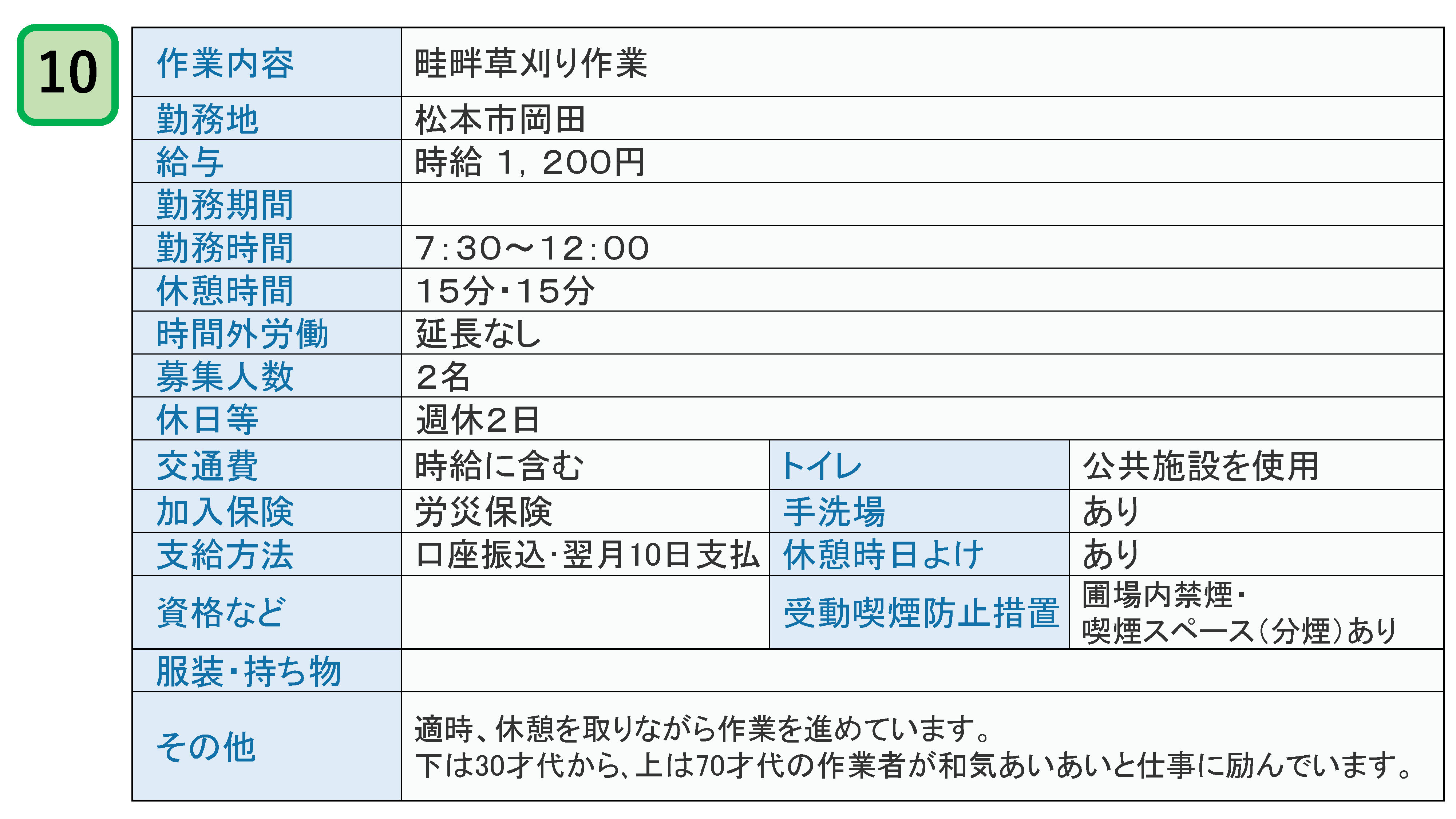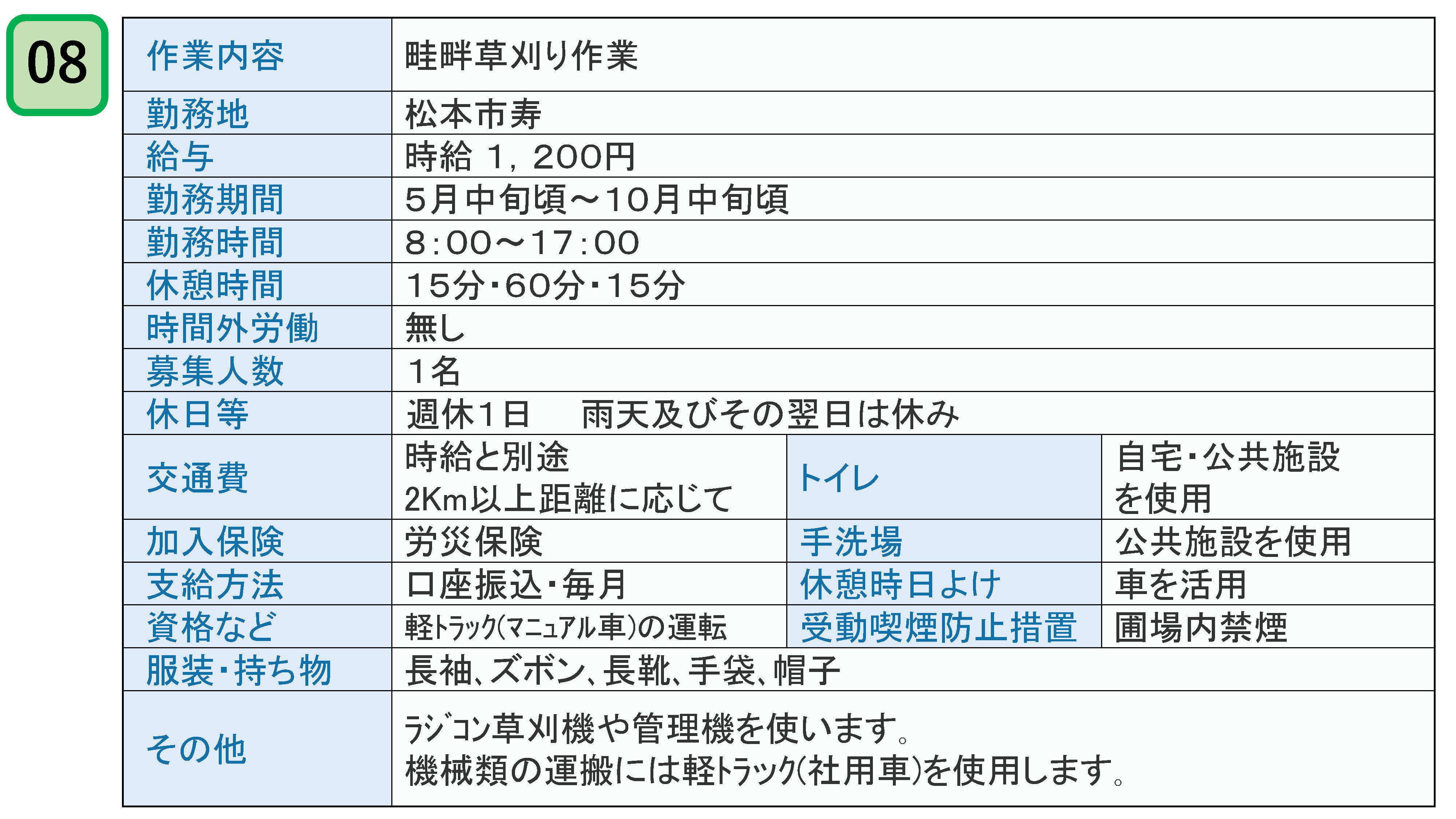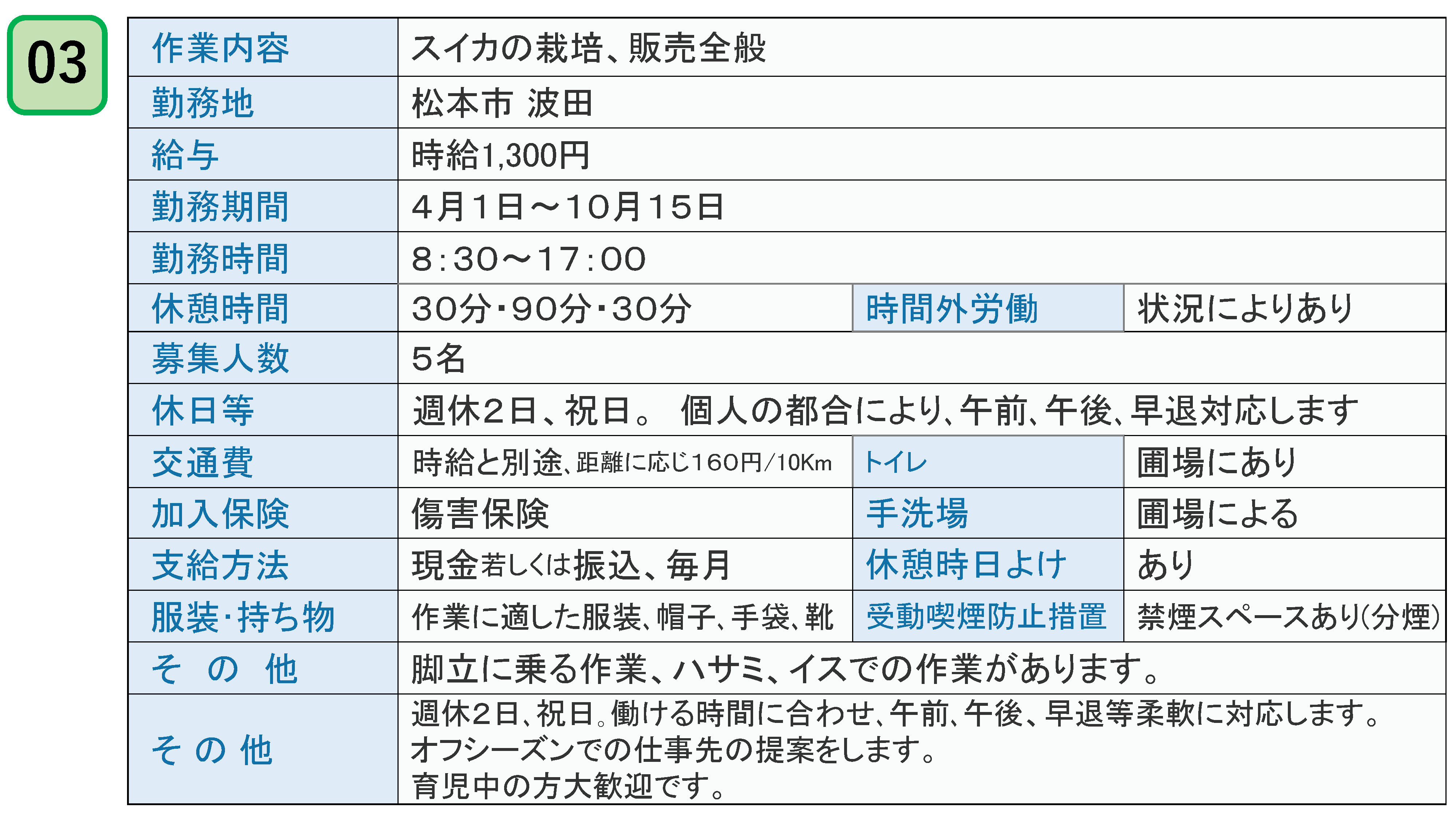 農作業のアルバイトを探している方(求職者)に対して、JA松本ハイランドが働き手を探す農家(求人者)を仲介斡旋するものです。雇用契約は、農家と求職者双方で合意のうえ締結いただくためトラブルに関しては、JAは一切の責任を負いませんのでご了承ください。